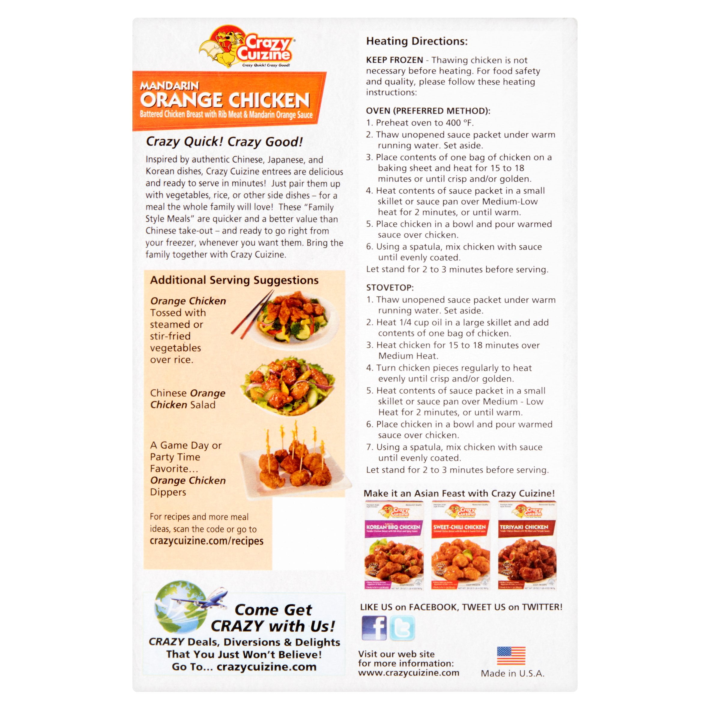The chicken gets brown and crispy when heated in the oven without the sauce the chicken bites taste just like plain pieces of breaded chicken. There are 250 calories in 1 cup 140 g of Crazy Cuizine Mandarin Orange Chicken. Costco Crazy Cuisine NAE Organic Chicken 41 Pound Box Price.