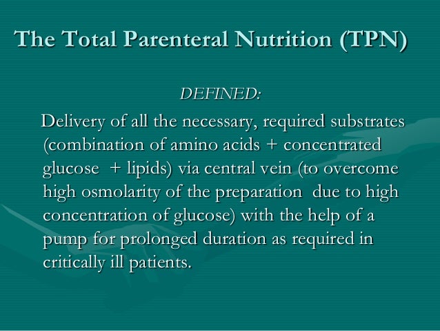 In the name of GOD Total Parenteral Nutrition TPN Presented by. You can cancel anytime within the 30-day trial or continue using Anesthesia Central to begin a 1-year subscription 3995 Total Parenteral Nutrition TPN First Things First assess treat for the following History and Physical assess for the following.