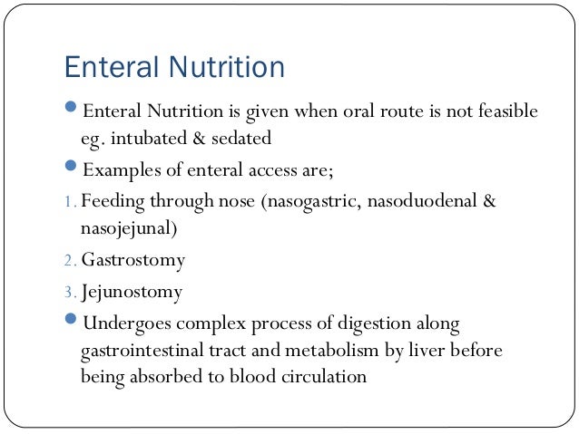 Pediatric Parenteral Nutrition - Free download as Powerpoint Presentation ppt PDF File pdf Text File txt or view presentation slides online. Giving nutrition in the form of tube feeding enteral or intravenous feeding parenteral is often considered a priority during critical illness in children. Enteral Nutrition Enteral Nutrition is given when oral route is not feasible eg.